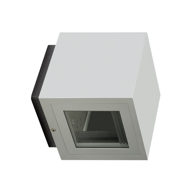 Apparecchio per esterno di forma cubica, per effetti a parete. Struttura: diffusore in vetro temprato ultrawhite. Corpo in alluminio pressofuso a basso tenore di rame o in inox AISI 316L. Viti inox a brugola in tinta. Interno interamente nero opaco per evitare fastidiose riflessioni luminose. Lenti ottiche e schermi dedicati da inserire in ogni finestra per ottenereeffetti speciali. Installabile a parete/soffitto ed a terra in giardino con apposito picchetto. La sorgente Led è orientata di 10° verso laparete per accentuare l'effetto wall-washer. Ingresso cavi dal retro.6,4W. 1280lm. 4000K. Bianco