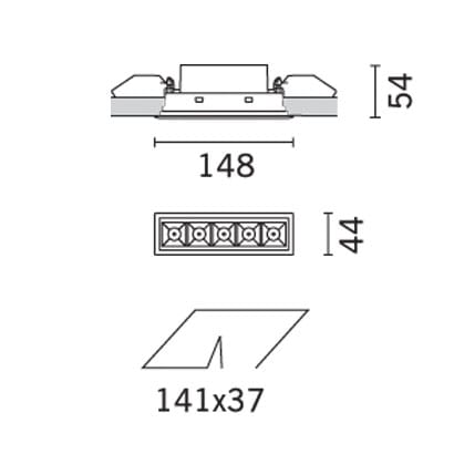 incasso a 5 celle - LED 10W - 900 lm - warm white medium. Apparecchio miniaturizzato ad incasso rettangolare a 5 elementi ottici con sorgenti LED - ottiche fisse - apertura medium. Corpo principale con superficie radiante in alluminio pressofuso, versione con cornice perimetrale di battuta. Ottiche ad alta definizione in termoplastico metallizzato, integrate in posizione arretrata nello schermo antiabbagliamento nero; la composizione strutturale del sistema ottico evita l’effetto puntiforme, permette diottenere una distribuzione luminosa definita e circolare e determina un'emissione ad abbagliamento controllato (UGR < 19). Fornito con gruppo di alimentazione elettronico collegato all’apparecchio. LED bianco warm - lifetime con flusso residuo 80% (L80):50.000 h - Ta 25°