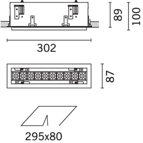 Apparecchio rettangolare ad incasso con sorgenti LED. Vano strutturale in lamiera di acciaio sagomata con faldina perimetrale di battuta. Il corpo lineare a 10 celle luminose, in alluminio pressofuso, permette di indirizzare l’emissione con possibilità di orientamento basculante +/- 30°. Ottiche ad alta definizione in termoplastico metallizzato, integrate in posizione arretrata nello schermo antiabbagliamento nero; la composizione strutturale del sistema ottico evita l’effetto puntiforme, permette di ottenere una distribuzione luminosa definita e circolare e determina un’emissione a luminanza controllata (UGR < 19). Fornito con gruppo di alimentazione dimmerabile DALI collegato all’apparecchio. LED bianco warm. Led life time con flusso residuo a 80%(L80): 70000h Ta a 25°C.