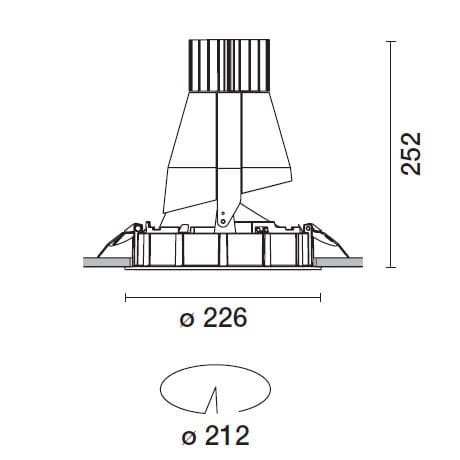 Apparecchio rotondo fisso ad incasso finalizzato all'utilizzo di lampada LED. Versione con falda per installazione ad appoggio. Riflettore metallizzato con vapori di alluminio sottovuoto con strato di protezione antigraffio. Corpo in alluminio pressofusoe sistema di dissipazione passiva. Prodotto completo di gruppo LED DALI 2000 lm in tonalità di colore warm e 4000K e driver separato dall'apparecchio. Flusso totale emesso [Lm]: 5000. Potenza totale [W]: 32.