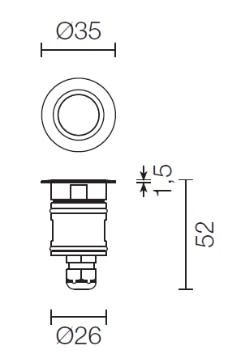Apparecchio a incasso da esterno o interno; 2W - 24Vdc; 1 power LED; 3000K; CRI: >80; ottiche: 10°; flusso totale: 88 lm (3000K); corpo in Acciaio Inox AISI 316L, ghiera in Acciaio Inox AISI 316L di spessore 10mm, schermo in vetro extrachiaro temprato con trattamento antigraffio di spessore 6mm; finitura: Acciaio Inox AISI 316L; temperatura di esercizio: -10°C +45°C; temperatura vetro: max 40°C (Ta 25°C); dotato di sistema IPS (utilizzare corrugato Ø20 min); grado di protezione contro i liquidi e i corpisolidi: IP68; grado di resistenza all'impatto IK08; sicurezza fotobiologica: gruppo rischio 1 secondo EN62471:2006; montaggio con cassaforma WC0201/WC0202, accessorio ghiera con molle WG0300 per installazione su pannellature, cartongesso; classe di isolamento III; peso 0,20kg; dimensioni ø35x52mm; foro d'incasso ø30mm; volume d'ingombro cassaforma Ø80x79mm; collegamento in parallelo, con cavo 1,5m tipo H05RN-F 2x0,75 Ø6,7mm; dimmerazione disponibile mediante dimmer in tensione; accessori disponibili: cassaforma WC0201/WC0202, molla WG0300 (spessore minimo 5mm), nido d'ape WH0101.