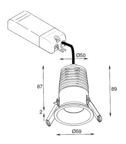 Apparecchio a incasso da interno; 8W - 230Vac 50Hz; 1 power LED Multi-chip; 3000K; CRI: >80; ottica: 54°; flusso totale: 425 lm (3000K); corpo in alluminio lega EN AW 6012 con trattamento di anodizzazione nera, cornice in alluminio lega EN AW 6012 verniciata bianco opaco Ral9003, schermo protettivo in PMMA ad alta riflettanza; finitura: bianco, nero; temperatura di esercizio: 0°C +45°C; grado di protezione contro i liquidi e i corpi solidi: IP40, IP44 installato; sicurezza fotobiologica: gruppo rischio 1secondo EN62471:2006; montaggio a incasso con molle in Acciaio Inox in controsoffitti di spessore da 5mm a 25mm; classe di isolamento II; peso 0,30kg; dimensioni ø59x89mm; foro d'incasso ø50mm; volume d'ingombro: Ø170x150mm; collegamento 230Vac 50Hz, cablato con alimentatore; dimmerazione disponibile mediante DALI, PUSH; in dotazione: alimentatore cablato,ad alta efficienza e PFC attivo; dimensioni alimentatore: 111x37x28 mm, 111x52x22 mm (1-10V + PUSH), 207x42x31 mm (DALI + PUSH).