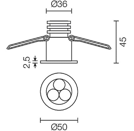 Apparecchio a incasso da interno; 3/6W - 350/500mA; 3 power LED; 3000K; CRI: 75÷85; ottiche: 24°; flusso totale: 348 lm (3000K a 500mA); corpo in alluminio lega EN AW 6012 con trattamento di anodizzazione bianca, cornice in ottone con trattamento estetico superficiale, ottica in PMMA ad alto rendimento; finitura: satinato; temperatura di esercizio: 0°C +45°C; dotato di sistema EPS; grado di protezione contro i liquidi e i corpi solidi: IP40; sicurezza fotobiologica: gruppo rischio 1 secondo EN62471:2006;montaggio a incasso con molle o con cassaforma WC1500 opzionale; classe di isolamento III; peso 0,20kg; dimensioni ø50x45mm; foro d'incasso ø43mm; volume d'ingombro ø140x90mm; collegamento in serie, cablato con cavo 1,5m tipo Fror Ø5 2x0,50; dimmerazionedisponibile mediante alimentatore dimmerabile.