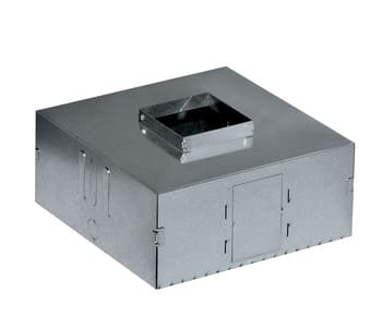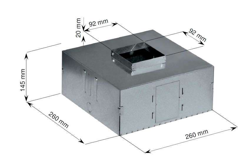 Fissare la cassaforma all’armatura, nel punto ove sarà posizionato il faretto da installare. Tracciare il percorso con i corrugati (Ø26mm) e infilarli nella cassaforma attraverso le apposite aperture laterali. I fori previsti sono per i corrugati di diametro 26mm. Prima della colata di calcestruzzo assicurarsi di sigillare eventuali fessure,(ad esempio tra tubo corrugato e cassaforma) per evitare la penetrazione del cemento. Procedere con la colata. Successivamente al disarmo della cassaforma individuareil foro del faretto: pulire liberando da eventuali residui presenti. 260x260x145mm.