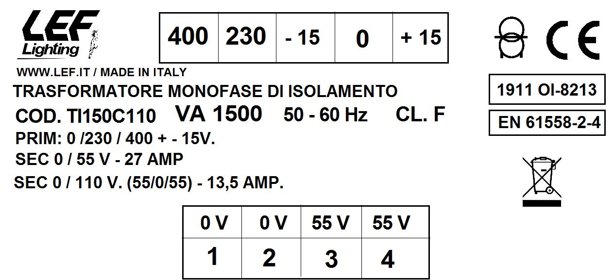 L.E.F. SRL - LEFTI150C110 TRASFORMATORE MONOFASE 1500VA 230.400V / 55÷110V - TI150C110