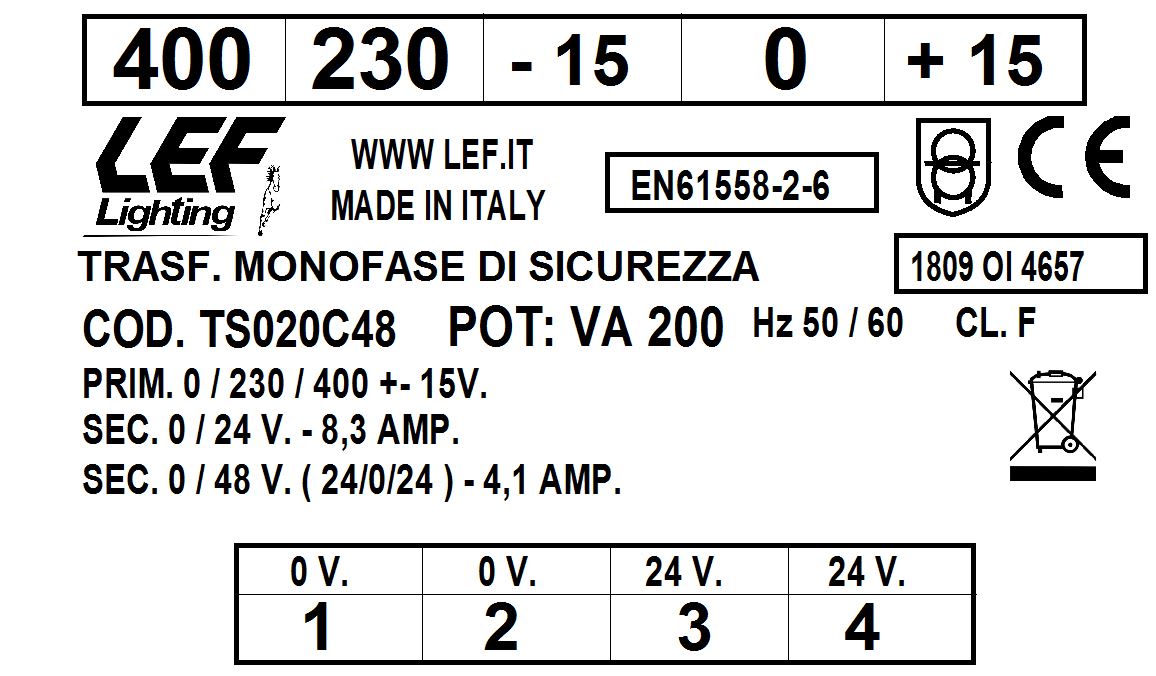 L.E.F. SRL - LEFTS020C48 TRASFORMATORE MONOFASE DI SICUREZZA 200VA 230.400V / 24-48V - TS020C48
