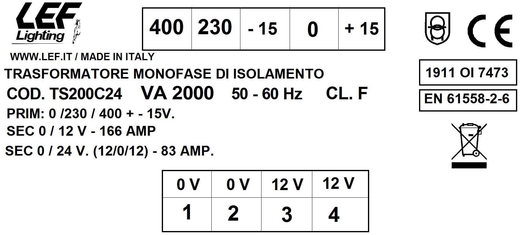 L.E.F. SRL - LEFTS200C24 TRASFORMATORE MONOFASE DI SICUREZZA 2000VA 230.400V / 12÷24V