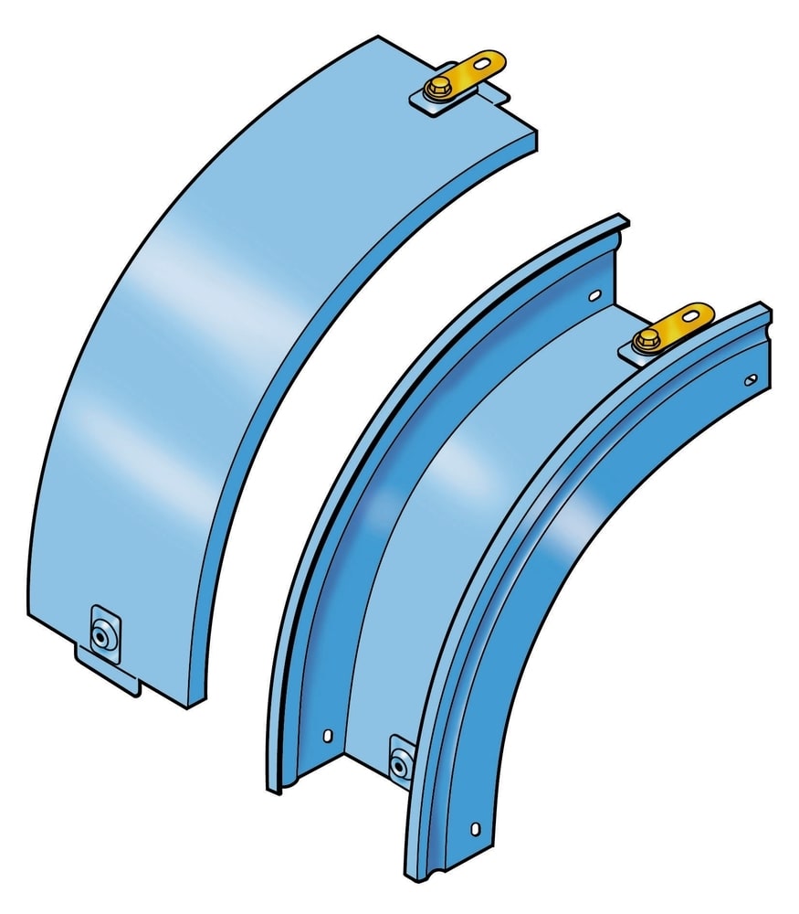 Curva in discesa a 90 completa di coperchio. Altezza: 75 mm. Larghezza: 100 mm. Finitura Z: Acciaio zincato sendzimir.