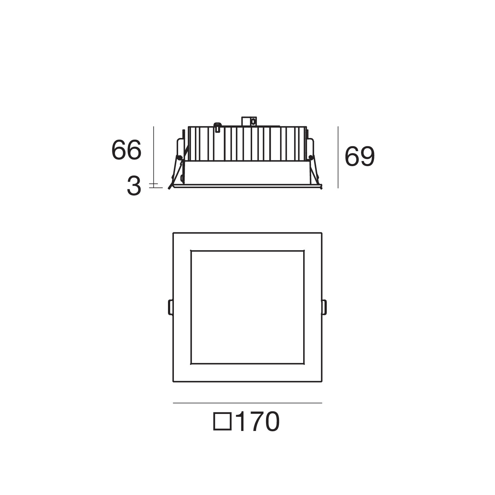 L'apparecchio presenta una classe di isolamento III ed è installabile a soffitto, con foro quadrato con misura 155 x 155 mm (nel cartongesso).