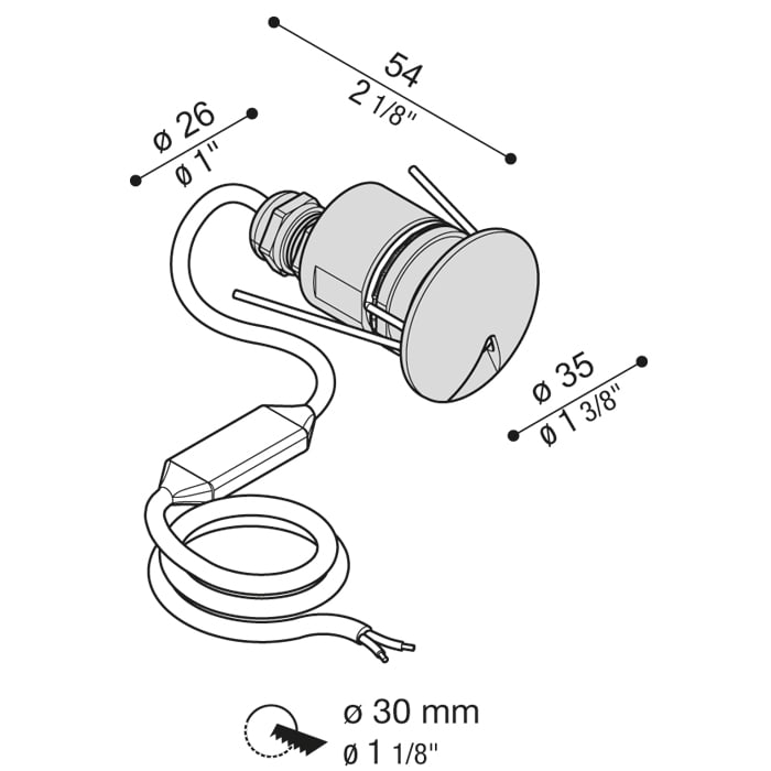 CNC35 Top S - Adatto per installazioni a incasso parete, incasso soffitto, incasso terra, anche per uso esterno. Idoneo per incassi da terra ad uso calpestabile, fissaggio mediante armatura da incasso fornita a parte. Prodotto finalizzato all’impiego di sorgenti luminose a LED per luce di accento e segnalazione. Corpo e ghiere in acciaio AISI316L. Diffusore in vetro temprato. Guarnizioni in silicone. 1.5 m di cavo di alimentazione H05RN-F pre-cablato e bloccato tramite pressacavo in Ottone Nichelato. Dimmerazione disponibile. Bulloneria in acciaio inox A4 o AISI 316L. Tutti i cavi sono provvisti di una speciale guaina che protegge il faretto dalle infiltrazioni di acqua e umidità. La molla di ritenuta si adatta sia per applicazioni che prevedono l'utilizzo di armatura da incasso che direttamente in controsoffittature in cartongesso. Versione in corrente costante 500 mA: utilizzare esclusivamente alimentatori di tipo SELV o equivalenti. Tutti i cavi vengono forniti integrati di un sistema elettronico che consente il collegamento non polarizzato del faretto. LED 2W 180lm 2700K 4,8V. Oticca stretto.