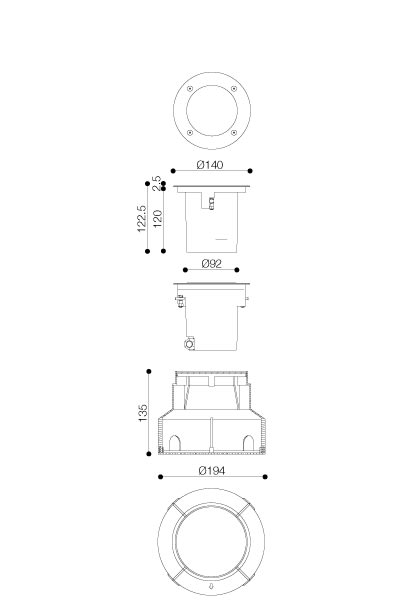 Apparecchio per interni ed esterni: Apparecchio con cornice tonda ad incasso a parete/pavimento carrabile/calpestabile con controcassa obbligatoria. Colore: Inox. Utilizzo: Percorsi pedonali, aree verdi, porticati, particolarmente indicata per illuminazione d’accento. Peculiarità: Utilizzabile a cielo aperto per alto grado di protezione (IP67). Risparmio energetico. Dimensioni compatte. Orientabile in varie direzioni. Versatilità delle ottiche. Carrabilità. Chiusura inferiore e superiore della controcassa per agevolare la cementazione. Caratteristiche tecniche apparecchio: Controcassa in tecnopolimero. Corpo in pressofusione di alluminio anodizzato. Diffusore in vetro temperato trasparente spessore 8mm. Gruppo ottico basculabile di ±15° su tutte le lampade. Cornice in acciaio inox AISI 316L. Carrabilità 2500Kg alla velocità massima di 20Km/h. Viteria in acciaio inox.