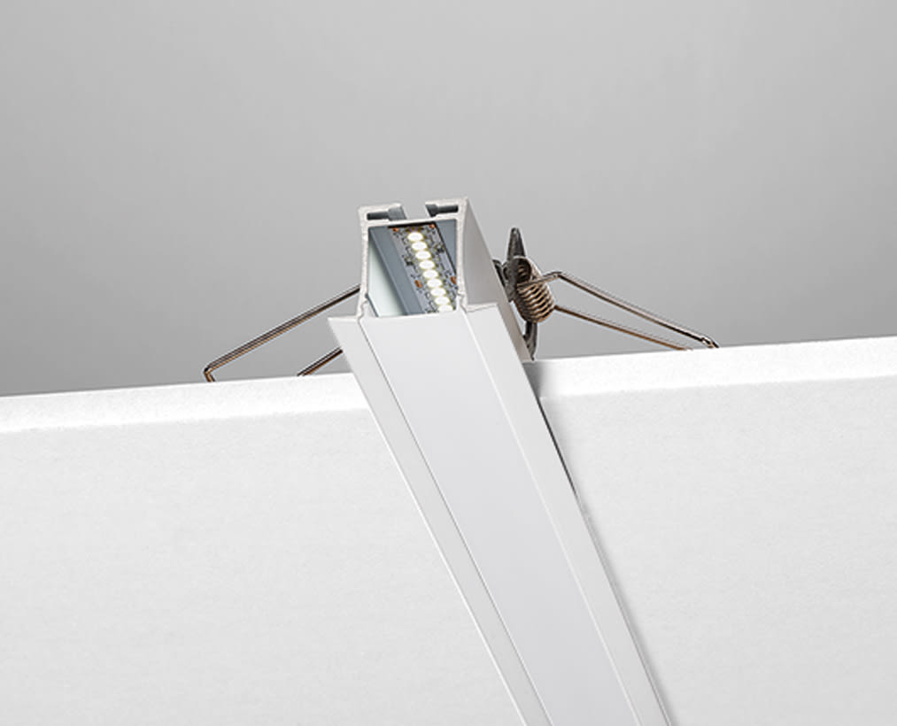 Profilo in alluminio bianco da incasso per striscia LED con diffusore trasparente di 2m. Tappi inclusi. Forare il profilo per il fissaggio. Completo di molle in acciaio.