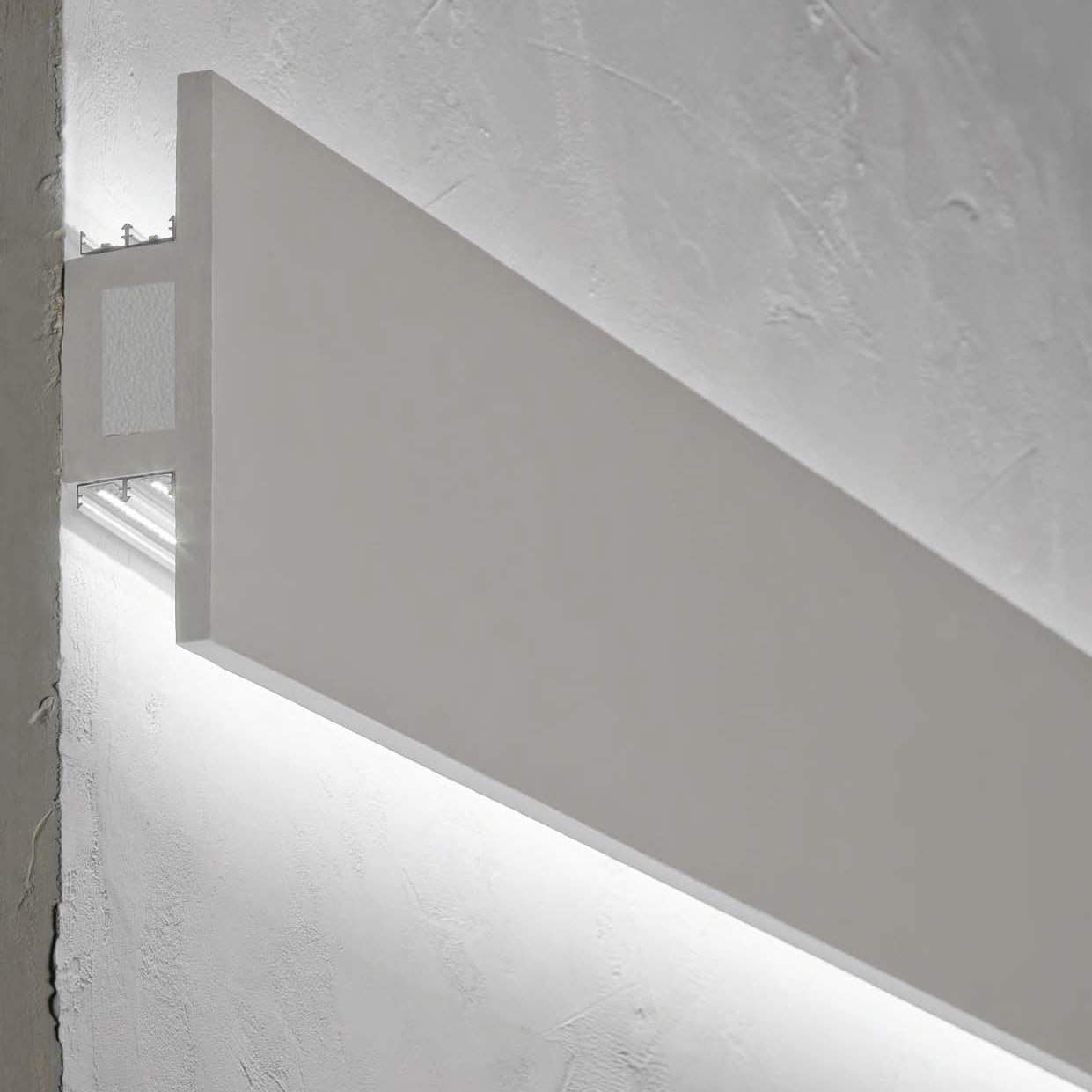Profilo prefinito in gesso, per installazione a parete, effetto bi-emissione. Elemento completo di quattro barre in alluminio per applicare fino a quattro strisce LED. Chiusure laterali da effettuare durante il montaggio.