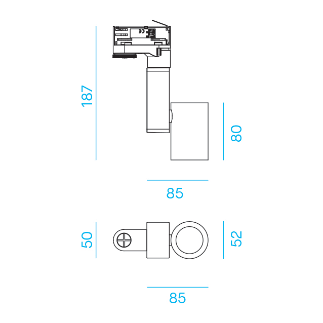 R50 - Proiettore LED orientabile per installazione su binario eurostandard. LED Bridgelux. Life time 50.000h (rendimento 70%). Corpo in alluminio verniciato bianco goffrato. Ottica intercambiabile in policarbonato metallizzato. Alimentatore Philips 220-240V - 50/60Hz incluso. LED 13W 1200lm 3000K - 15°.