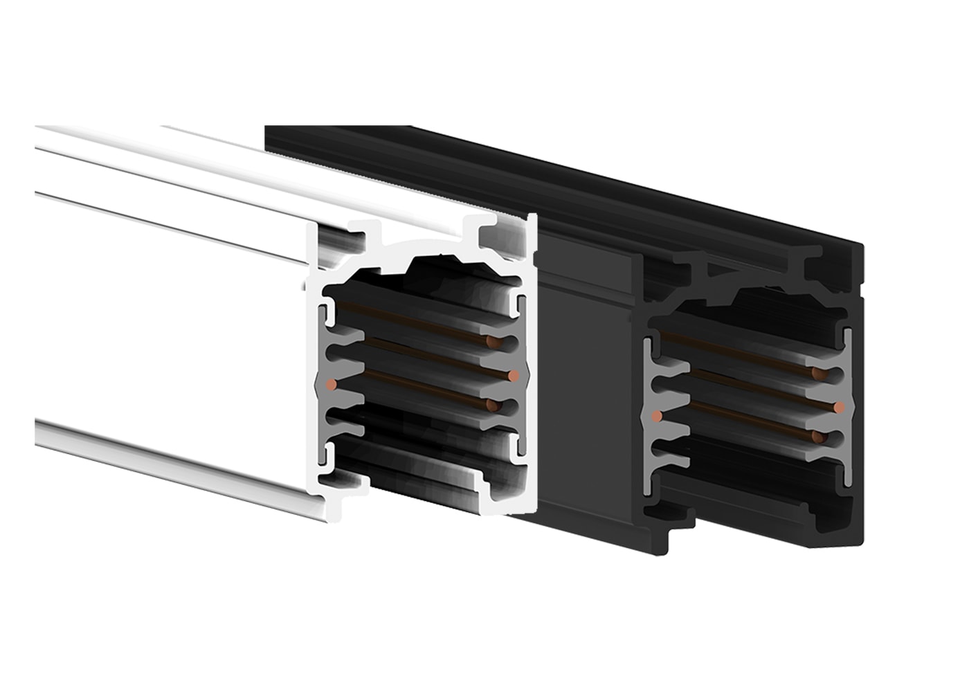 Profilo di alluminio estruso verniciato nero, per installazione a plafone, a sospensione e ad incasso. Binario elettrificato trifase (tensione di rete 230/250V - 16A) a 6 conduttori: 4 per modalità trifase, 2 per la gestione di un qualsiasi segnale (es. dali, dmx, lon, eib, ecc). Lunghezza 1m. Il sistema formato da n. 3 conduttori di fase + neutro permette di ottenere n.3 circuiti distinti per n.3 accensioni separate. Rete trifase: carico complessivo 16A (10500VA), DALI 2X1A (100VA). Rete monofase: carico massimo di 16A (3500VA), DALI 2x1A. Accessori da ordinare separatamente. Normativa: EN 60570. Colore: Bianco. L: 1m.