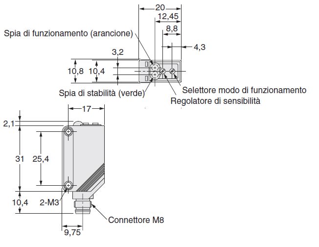 Sensore fotoelettrico E3ZR86, miniatura radiale, riflessione polarizzata 4 m, uscita PNP, impulso-luce/buio, connettore M8