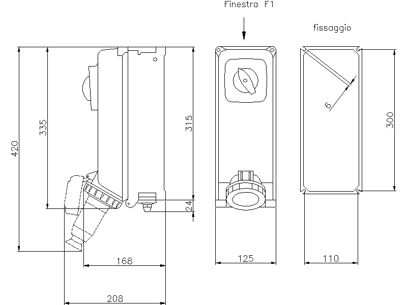 Presa da parete con interruttore magnetotermico, blocco meccanico, spia di segnalazione intervento in contenitore modulare in lega di alluminio IP67 >>IK10. Passaggio lato superiore con finestra tipo F1. Manopola lucchettabile.