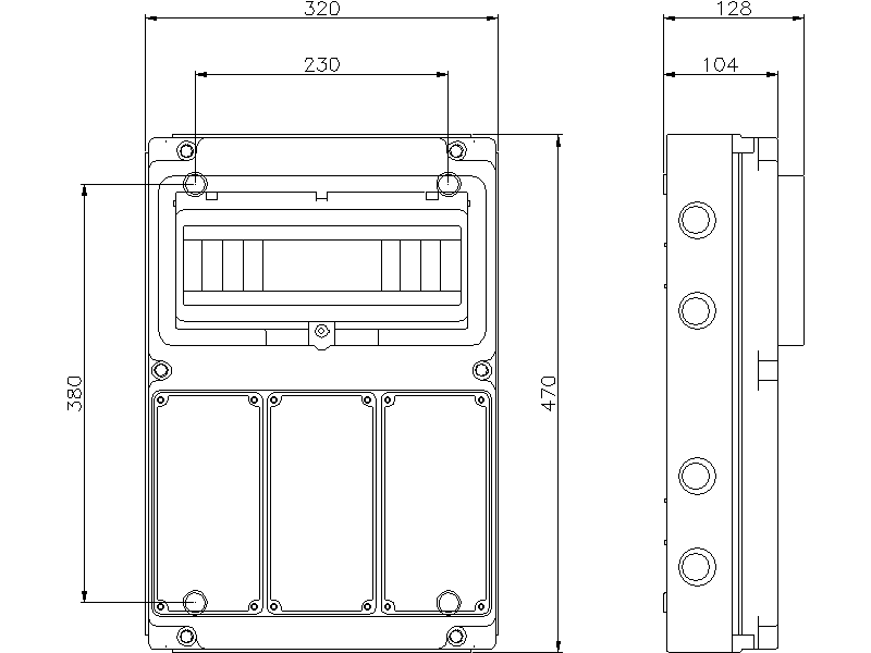 Quadri stagni flangiati per installazione a parete o ad incasso di prese da 16A e 32A con interruttore di blocco e guida EN50022 per fissaggio di apparecchi modulari. N° prese installabili: 3. N° moduli EN50022: 14. Potenza dissipabile: 56W. Dimensioni: 320x470 mm. Grado di protezione IP55