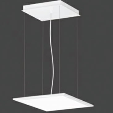 Apparecchio LED quadrato a sospensione per interni, composta da: Corpo in alluminio estruso, verniciato. Tecnologia Sidelight LED e ottica di orientamento in tecnopolimero per una distribuzione luminosa omogenea sull'intera area diffondente. Diffusione luminosa diretta e leggera retroilluminazione. Indice di resa cromatica > 80. Tolleranza cromatica (MacAdam) = 3 SDCM. Completo di sospensione in cavo d’acciaio (1,5 m), cavo di alimentazione trasparente e rosone. Completo di alimentatore elettronico. Colore / RAL: WH-RAL9016 / Bianco RAL9016 / Goffrato. Angolo Ottica: 2 x 55°. Lampada: LED 27W 2700Lm 3000K.