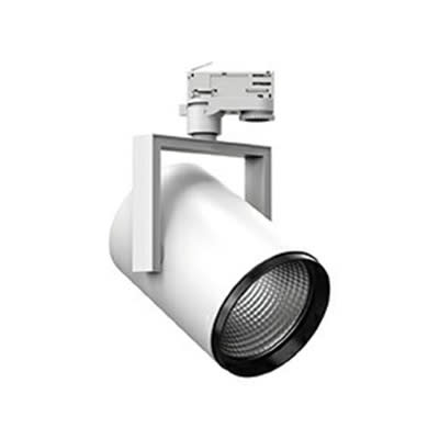 AS425 LED MEDIUM REFLECTOR - Proiettore LED da binario per interni, costituito da: Corpo faretto in profilo d'alluminio estruso e pressofuso, vernicato a polvere. Corpo faretto rotante e basculante. Riflettore in alluminio purissimo con sfaccettature sferiche ad alta brillantezza per il massimo rendimento della lampada ed una resa cromatica neutra. Anello con chiusura a baionetta per la sostituzione senza utensili del riflettore e del blocco ottico. Riflettore in esecuzione Spot. Tolleranza cromatica (MacAdam) = 3 SDCM. La durata di vita LED ammonta a 50.000 ore fino al decadimento del flusso luminoso al 80% (L70B10 50.000 h). Completo di adattatore trifase universale. Completo di alimentatore elettronico. Il montaggio a soffitto non richiede l'uso di utensili. Completo di vetro di protezione. LED 20W 2890lm 4000K CRI 80 - 2 x 15°. Colore: Bianco RAL9010 / Goffrato.