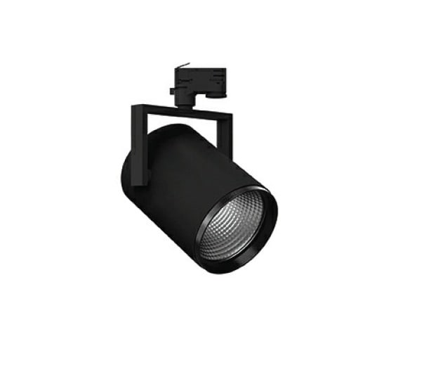 Proiettore LED da binario per interni, costituito da: Corpo faretto in profilo d'alluminio estruso e pressofuso, vernicato a polvere. Corpo faretto rotante e basculante. Riflettore in alluminio purissimo con sfaccettature sferiche ad alta brillantezza per il massimo rendimento della lampada ed una resa cromatica neutra. Anello con chiusura a baionetta per la sostituzione senza utensili del riflettore e del blocco ottico. Tolleranza cromatica (MacAdam) = 3 SDCM. Indice di resa cromatica > 80. Lifetime LED60.000 h al 80% del flusso luminoso (L80B10). Completo di adattatore trifase universale. Completo di alimentatore elettronico. Il montaggio a soffitto non richiede l'uso di utensili. Completo di vetro di protezione. Colore / RAL: BK-RAL9005 / Nero RAL9005 / Goffrato. Angolo Ottica: 2 x 6°. Lampada: LED 35W 4400Lm 4000K.