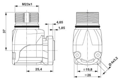 Gerätesteckverbinder, Vorderwand, gewinkelt fest, Schraubverriegelung, M23, Polzahl: 16, Kontaktart: Buchse, Crimpanschluss, O-Ring axial, 4x Ø 3,2, geschirmt: ja, Flanschmaß: 26 mm x 26 mm