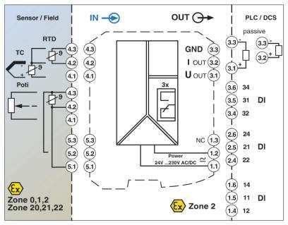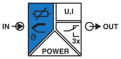 Eingang für Widerstandsthermometer, Thermoelemente, Widerstandsgeber, Potenziometer und mV-Quellen, [Ex ia] IIC. Programmierung während des Betriebs, bei angeschlossenem Ex-Messkreis und auch spannungslos über Programmieradapter IFS-USB-PROG-ADAPTER. Kaltstellenkompensation mit separatem Stecker.
