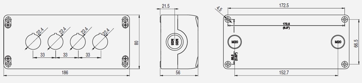 Scatola in policarbonato antiurto autoestinguente a doppio isolamento, resistente ai raggi UV caricato fibra vetro, con elevata resistenza agli urti. Idonea per il montaggio dei dispositivi di comando e segnalazione Ø 22 mm • Dimensioni: 186x80 H:56