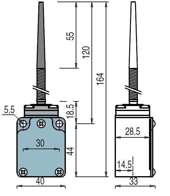 Interruttore di posizione ad asta a molla con puntale in plastica, Custodia metallica, una entrata cavi filettata, IP67 secondo IEC 60529 con pressacavo avente grado di protezione uguale o superiore. 1NO-1NC scatto rapido.