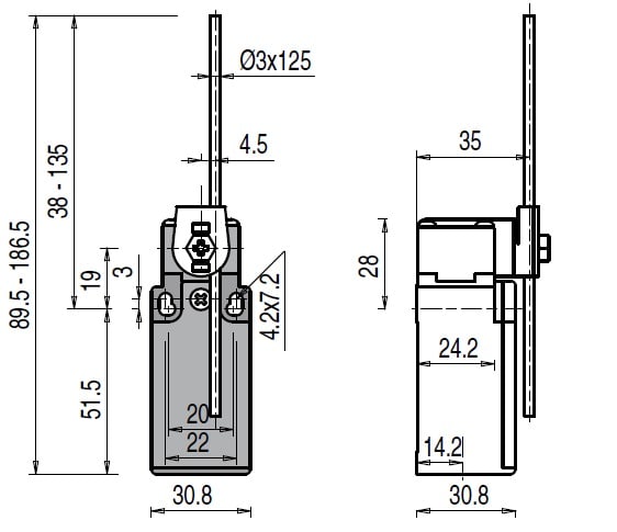 Interruttore di posizione a leva girevole con asta tonda regolabile, Custodia in tecnopolimero, una entrata cavi filettata, IP67 secondo IEC 60529 con pressacavo avente grado di protezione uguale o superiore, 1NO+1NC scatto rapido.