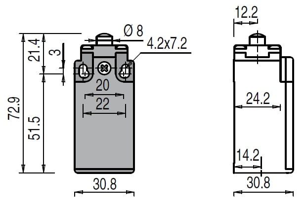 Interruttore di posizione a pistoncino corto, Custodia in tecnopolimero, una entrata cavi filettata, IP67 secondo IEC 60529 con pressacavo avente grado di protezione uguale o superiore. 1NO+1NC scatto lento, con apertura positiva.
