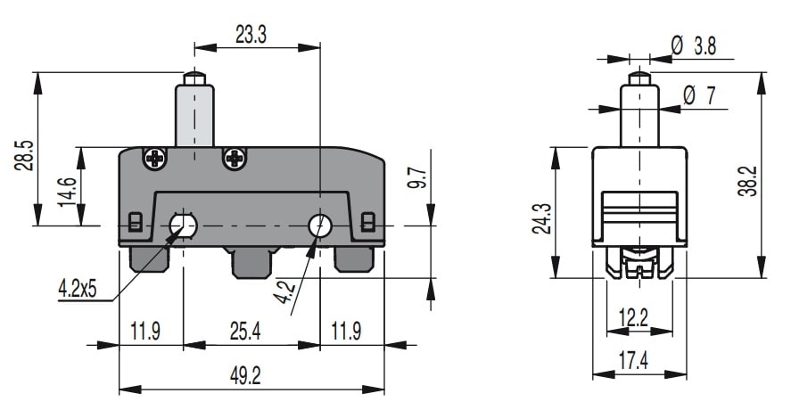 Microinterruttore a pulsante stretto. Temperatura ambiente: Da -25°C a +85°C. Custodia: Custodia in tecnopolimero rinforzato con fibra di vetro, autoestinguente ed antiurto. Tipo di terminale: A vite con piastrina autosollevante. Unità di contatto: 1NO+1NC, scatto rapido in deviazione. Grado di protezione massimo: IP40 con copriterminali. Tipo di azionamento: Azione diretta. Azionatore: A pulsante stretto. Apertura positiva: Sì