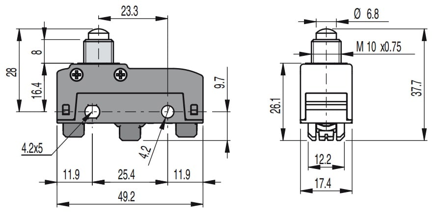 Microinterruttore a pulsante filettato. Temperatura ambiente: Da -25°C a +85°C. Custodia: Custodia in tecnopolimero rinforzato con fibra di vetro, autoestinguente ed antiurto. Tipo di terminale: A vite con piastrina autosollevante. Unità di contatto: 1NO+1NC, scatto rapido in deviazione. Grado di protezione massimo: IP40 con copriterminali. Tipo di azionamento: Azione diretta. Azionatore: A pulsante basso. Apertura positiva: Sì