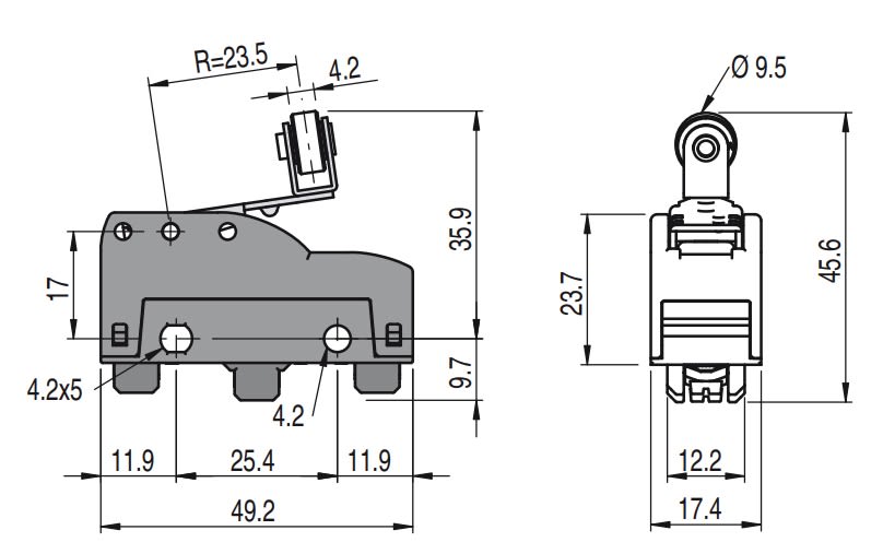 Microinterruttore a leva corta con rotella trasversale. Temperatura ambiente: Da -25°C a +85°C. Custodia: Custodia in tecnopolimero rinforzato con fibra di vetro, autoestinguente ed antiurto. Tipo di terminale: A vite con piastrina autosollevante. Unità di contatto: 1NO+1NC, scatto rapido in deviazione. Grado di protezione massimo: IP40 con copriterminali. Tipo di azionamento: Azione diretta. Azionatore: A leva con rotella trasversale (l=23,5 mm)