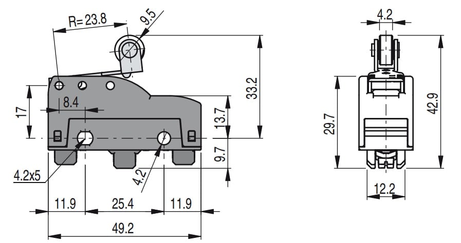 Microinterruttore a leva con rotella. Temperatura ambiente: Da -25°C a +85°C. Custodia: Custodia in tecnopolimero rinforzato con fibra di vetro, autoestinguente ed antiurto. Tipo di terminale: A vite con piastrina autosollevante. Unità di contatto: 1NO+1NC, scatto rapido in deviazione. Grado di protezione massimo: IP40 con copriterminali. Tipo di azionamento: Azione diretta posteriore. Azionatore: A leva con rotella (l=17,8 mm). Apertura postitiva: Sì