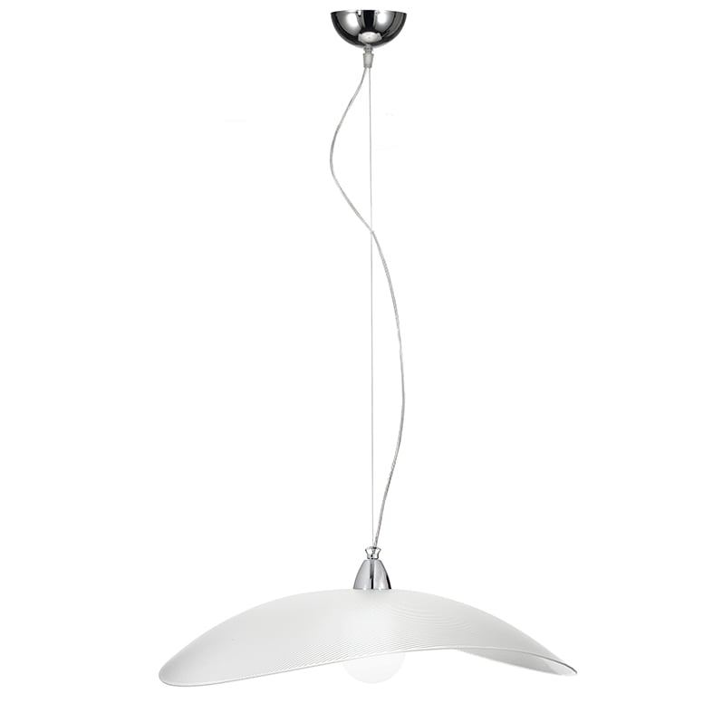 Lampada a sospensione, da parete e a soffitto in vetro satinato serigrafato. Struttura e particolari in metallo cromato. Proposta in diverse misure erelative potenze. Attacco E27 che consente di mont are lampadina a LED.