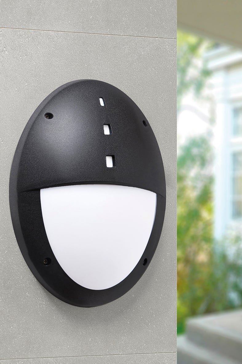 Apparecchio a parete e a plafone per esterno (IP66). Realizzato in policarbonato antiurto, stabilizzato ai raggi UV, inattaccabile da ruggine e corrosione. Proposto con attacco E27, che consente di montare lampadina LED. Disponibile nella forma tonda e ovale, in versione tutta luce o con palpebra, in due finiture (grigio e nero). Disponibili giunti certificati IP68 per la realizzazione delle connessioni elettriche, sicure, durevoli e con barriera anticondensa.