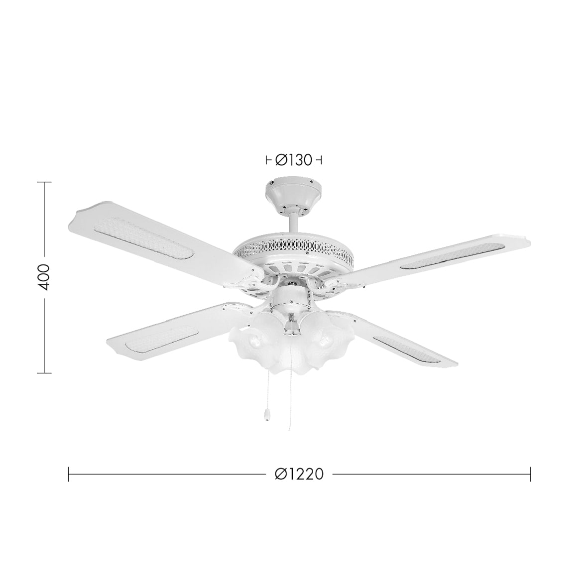 Ventilatore a soffitto dallo stile classico a quat tro pale in legno con inserti in paglia di Viennae tazze portalampada in vetro. Proposto in finitura bianca. Dotato di invertitore di marcia estate-inverno. Predisposto per telecomando a infrarossi da acquistare separatamente (cod.7570) o accensione e regolazione della velocit? tramite corda tirett o.