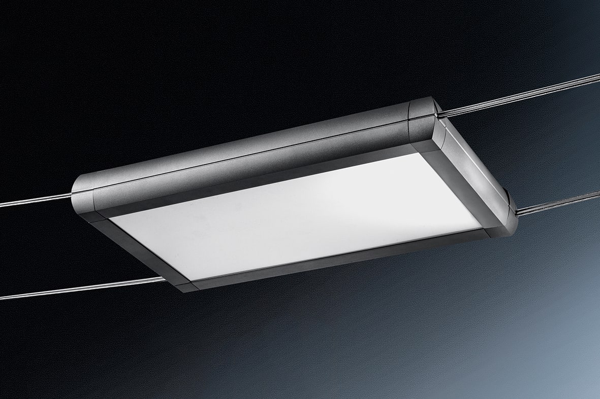 Sistema a tesata con coppia di cavi con interasse320mm: permette di installare apparecchi con fonte luminosa con LED integrato o con attacco tradizionale (GU10, R7s, E27 che consentono di montare lampadina LED). Corpi illuminanti in estruso di alluminio (verniciato bianco opaco o grigio opaco) e di ffusore in policarbonato. Disponibili in versioneluce diffusa, monoemissione o biemissione o a spot con corpo illuminante orientabile su due assi di ?35? rispetto all'asse verticale e di ?90? rispetto all'asse orizzontale. LED disponibile in due gr adazioni (3000K e 4000K).