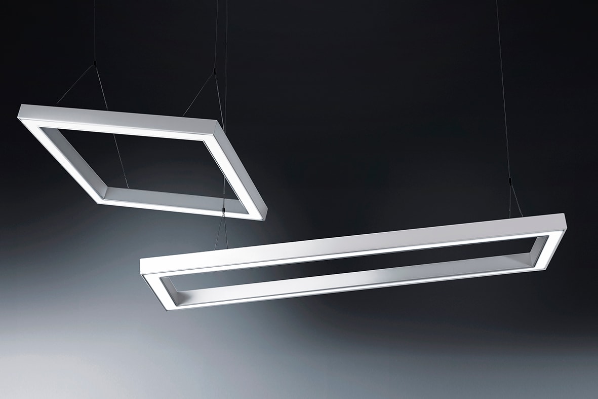 Apparecchio LED per interno a sospensione a luce diretta diffusa. Corpo in alluminio estruso, verniciatura a polveri epossidiche, disponibile in finitura bianco goffrato. Diffusore in policarbonato opale. Disponibile in forma quadrata o rettangolare, in due temperature colore (3000K e 4000K) e in versione DALI su richiesta. Alimentatore in remoto a lloggiato nell'apposito rosone.