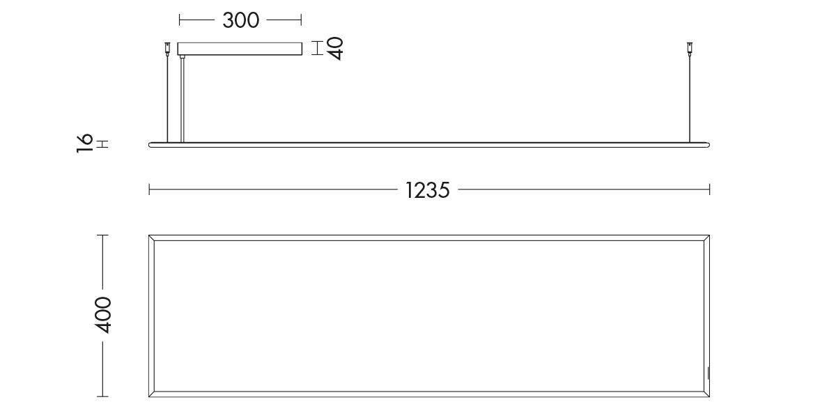 Apparecchio LED biemissione a sospensione composto da una sottile cornice in alluminio estruso di colore bianco (h. 16mm) e da uno schermo in PMMA trasparente. La luce viene convogliata lungo tutta la superficie grazie ad una micro-incisione a lasereffettuata nel PMMA (UGR<19). Apparecchio disponibile in due temperature colore (3000K e 4000K) e in versione On-Off. Su richiesta DALI e interfacciaCasambi. Alimentatore integrato nel rosone dell'ap parecchio.