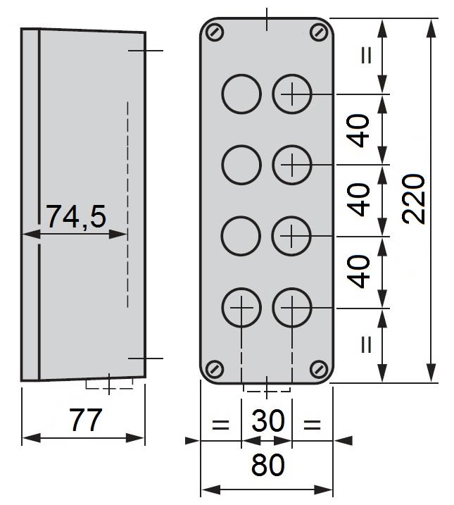 Pulsantiera vuota in lega di zinco pressofuso con fori. Base e coperchio blu. Dimensioni (LxAxP): 80x220x74,5, fori su 2 file verticali e 4 orizzontali