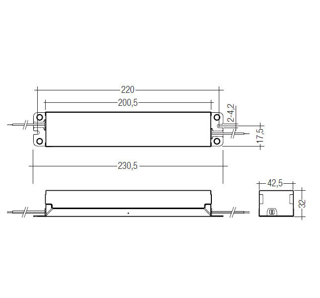 TALEX driver LC 60W 12/24V IP66 slim SNC. Fixed output constant voltage built-in control gear for LED in 12/24 V• Input voltage range 220 – 240 VAC• Max. output power 60 W• Connection cable with stripped cable end (300 mm ±10 mm)• Polarity identifiers, secondary + red / – black• IP66 metal casing• Nominal life-time up to 30,000 h (at ta 50 °C with a failure rate max. 0.2 % per 1,000 h)• 3-year guarantee• Complies with CLASS C from 70 to 100 % load according to EN 61000-3-2. Type of protection IP66• Metalcasing• SELV• Low power loss• Over temperature, over load and short-circuit protection. 230 x 42,5 x 32 mm.