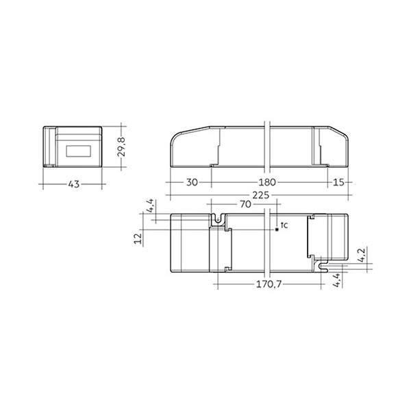 LC 60W 24V SC SNC - LED Driver a tensione costante. Tensione d'uscita 24 V. Potenza d'uscita max. 60 W. Dimmerabile con dimmer LED PWM. Durata nominale di max. 50.000 h. 5 anni di garanzia. Illuminazione di modanature, accenti su facciate e illuminazione indiretta di soffitti. Copertura policarbonato bianco. Tipo di protezione IP20. Tensione in uscita 25 V. Potenza d'uscita 18 – 60 W. Dimensioni L x l x H: 225 x 43 x 29,8 mm.