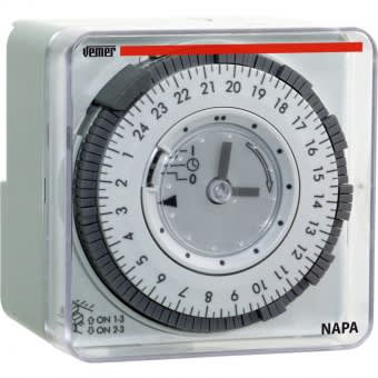 Interruttore orario elettromeccanico con quadrante a cavalieri e programmazione giornaliera. • Alimentazione: 230V AC 50/60 Hz - senza riserva di carica • Tempo minimo di intervento: 15 minuti • Visualizzazione dello stato ON del contatto • Portata contatto: 16A / 250V AC • Installabile a pannello, a parete o su guida DIN.