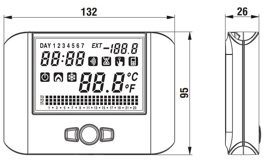 Cronotermostato da parete con programmazione settimanale e alimentazione a batterie. La tastiera è nascosta sotto lo sportellino, a tutto vantaggio dell'estetica. La funzione “blocco tastiera” con password, utile ad esempio per installazioni in luoghi pubblici, impedisce modifiche delle impostazioni a persone non autorizzate. I due ingressi consentono il collegamento di un combinatore telefonico per l’accensione o lo spegnimento a distanza e il collegamento di una sonda di temperatura esterna.