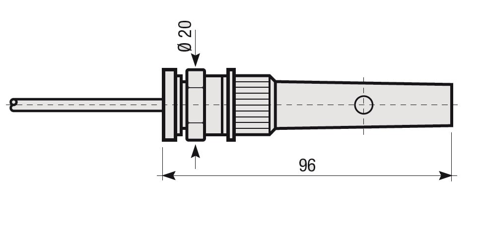 Elettrodo unipolare che trova impiego nel controllo del livello di liquidi elettricamente conduttori in accoppiamento con il relè di controllo livello liquidi (LCR). Completo di porta elettrodo in nylon per la protezione contro i contatti accidentali. Viene usato in serbatoi, metallici e non, ed in pozzi anche di piccolo diametro