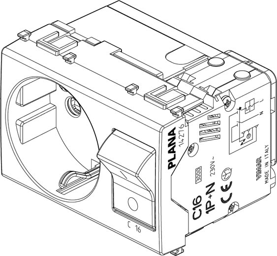 Presa SICURY 2P+T 16 A standard italiano tipo P30 (contatti di terralaterali e centrale), interbloccata con interruttore automaticomagnetotermico 1P+N C 16, 230 V~ 50 Hz, p.i. 3000 A, bianco - 3 moduli