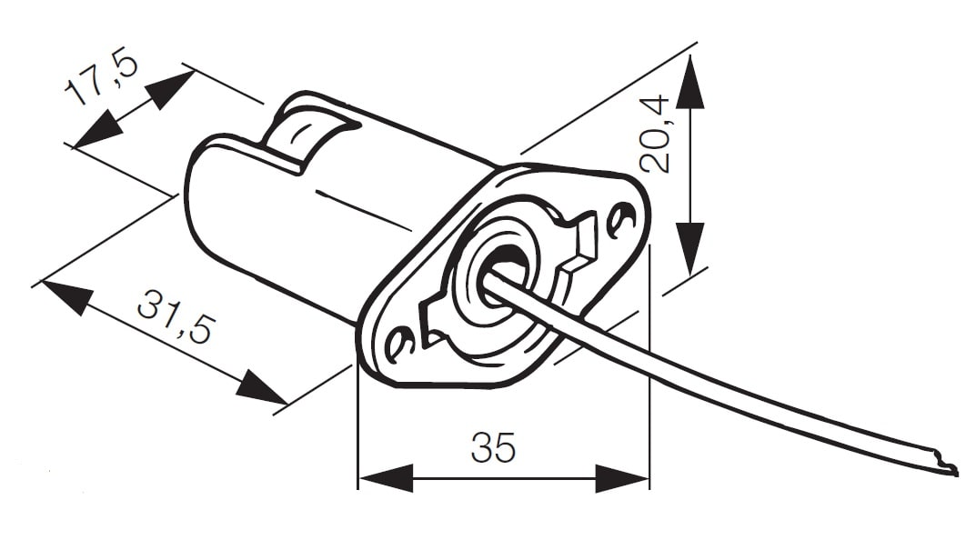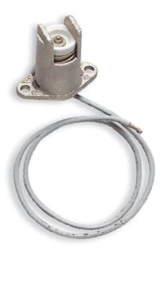Portalampade metallico con base di fissaggio e pastiglia steatite 10 A 250 V attacco R7s per lampade alogene fino a 1500 W, 350 mmcavo teflon PTFE 1,5 mm2. Massima temperatura d’impiego continuo del portalampade 300 °C, del cavo 250 °C.Fori di fissaggio ø 3,3 mm interasse 28 mm