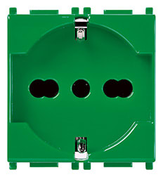 Presa SICURY 2P+T 16 A 250 V~ universale, per eurospine 2P 2,5 A, spine 2P e 2P+T 10 A e 16 A standard italiano, spine 2P+T 16 A standard tedesco, materiale antibatterico, verde - 2 moduli. Non realizza il collegamento di terra con la spina standard francese